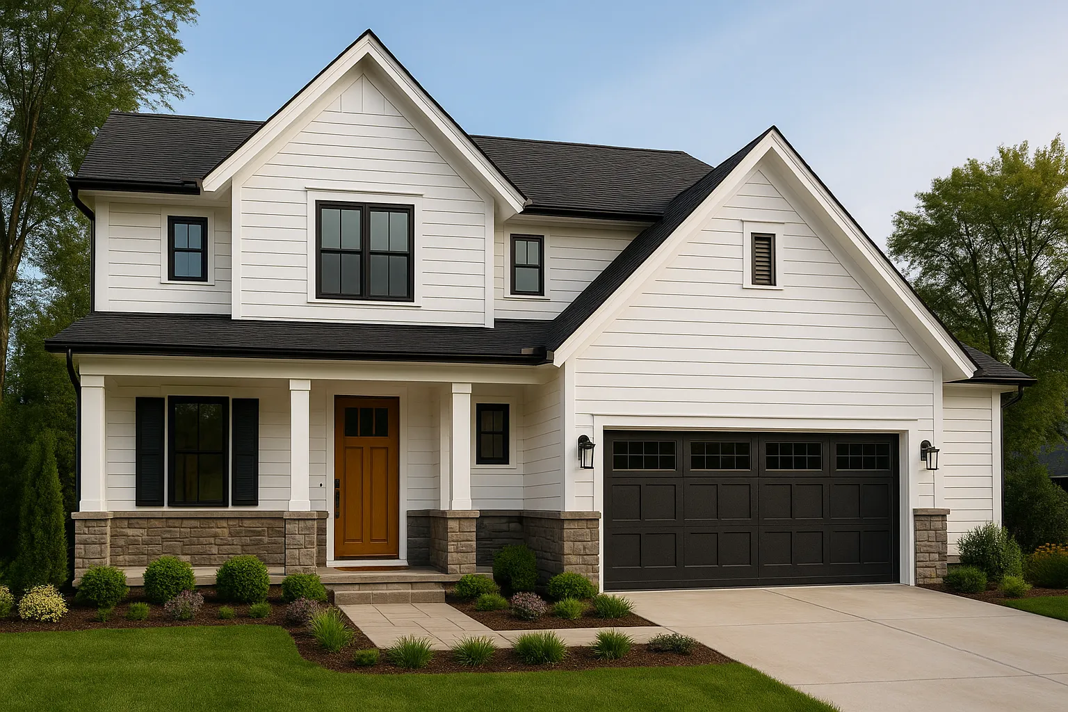 • Rustic Farmhouse – White siding, black accents, and natural wood details.