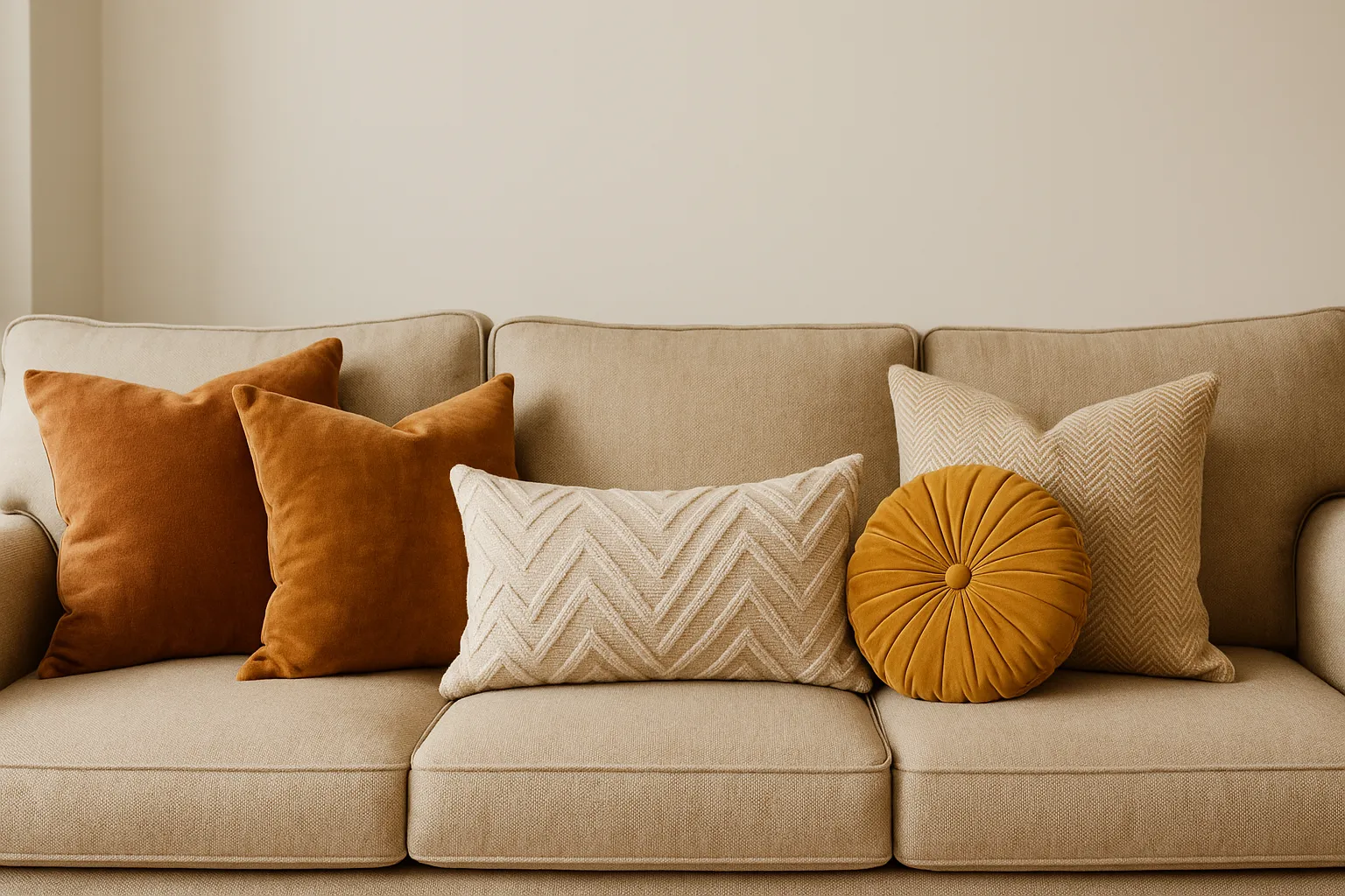 A golden rule: mix sizes. Pairing larger pillows at the back with smaller, varied shapes in front creates depth and visual interest. If all your pillows are the same size, your couch will look flat and uninspired.